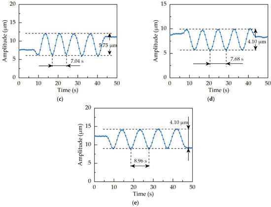The amplitude curve of spindle vibration of 1X frequency. (a) Rotation speed of 350 r/min; (b) rotation speed of 800 r/min; (c) rotation speed of 900 r/min; (d) rotation speed of 1000 r/min; (e) rotation speed of 1100 r/min.
