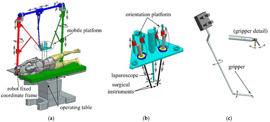 - One 6-DOF parallel robot (patent pending [32])—guides a triangular mobile platform (Figure 1a) that contains a 1-DOF insertion mechanism for the laparoscopic camera;