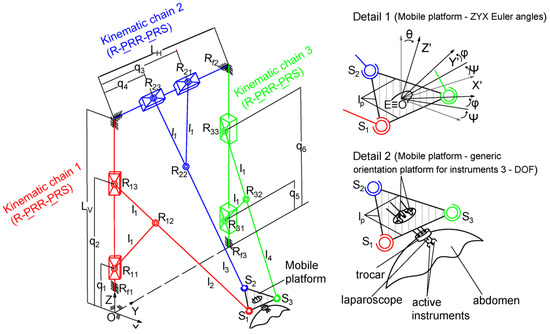 - The three kinematic chains guide the mobile platform via three passive spherical joints, S1, S2, and S3, respectively. The mobile platform contains two orientation platforms which are illustrated in Figure 2 (Detail 2) as generic mechanisms (to point out the functionality). The kinematic scheme of these orientation platforms is presented in [29];