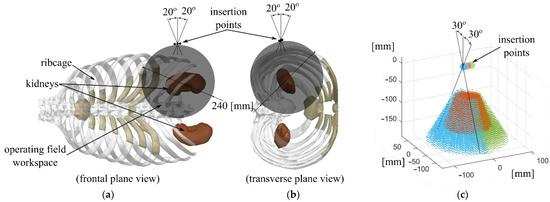 The proposed intraoperative workspace for the SILS robotic system: (a) frontal plane view showing the desired workspace with respect to the ribcage; (b) transverse plane view of the desired workspace; (c) the workspace of the surgical instruments with respect to the insertion points (brown—laparoscope, blue and green—active instruments).