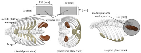 The proposed external workspace for the 6-DOF SILS robotic system (cylinder with radius 75 [mm] and height 75 [mm] and its position with respect to the ribcage).