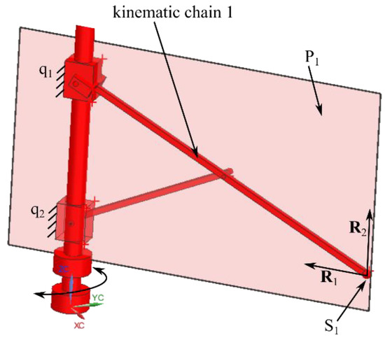 To study the output singularities, the characteristic tetrahedron was used [30], which states that a singularity occurs when the geometry of the tetrahedron is degenerate (e.g., faces are coplanar, etc.). The tetrahedron is composed of three faces defined by characteristic planes spanned by reciprocal wrenches at each spherical joint of the three kinematic chains and a base defined by the plane of the mobile platform. To define the characteristic planes associated with the three kinematic chains (for the 6-DOF parallel robot for SILS), first, the actuators are considered fixed, and then two reactive forces for the remaining passive motion are defined (at the level of the spherical joint). Figure 5 illustrates this concept on the kinematic chain 1, with the actuators q1 and q2, the spherical joint S1, and the reactive forces R1 and R2, respectively (which span the characteristic plane P1). Figure 6 illustrates how these planes intersect to form the characteristic tetrahedron (in a nonsingular pose).