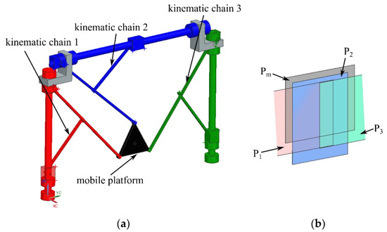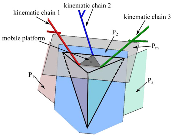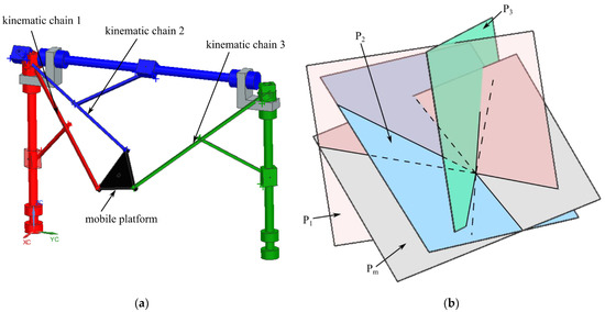 As an example, for the 3-R-PRR-PRS parallel robot, for θ = 0 rad, φ = π/2 rad, the factor F (Equation (A1)—Appendix A) vanishes. In this configuration, the mobile platform is in a vertical pose. Figure 8 shows an example of this singularity, (a) the parallel robot poses and (b) the characteristic planes (P1, P3, Pm) intersecting in a line. It can be shown (at least for this example) that the characteristic plane P2 also intersects that line; therefore, this singularity is the special case of Case 1 discussed previously (since all the characteristic planes intersect at a point).