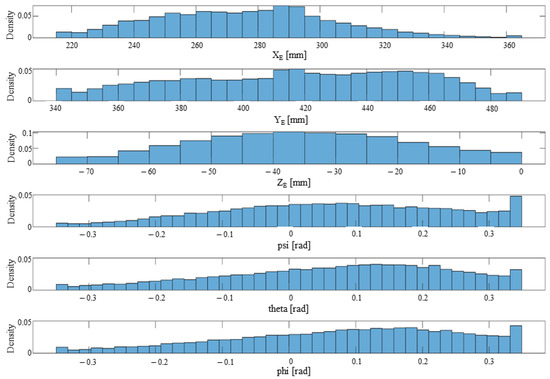 Figure 16. Mobile platform coordinates distribution density for the solution set SOLS(m) (m = 1,…, 28,568). - A subset SOL(k) (k = 1, …, 931) was selected from SOLS(m) (m = 1, …, 28,568) which yield real values for qi (i = 1, …, 6) for all mobile platform coordinates in WS_DATA. Furthermore, the ranges Q_RANGE(k) for qi (i = 1, …, 6) of each solution the subset SOL(k) were evaluated to determine which solutions yield feasible mechanisms (where, e.g., the actuation axes do not cross). For the viable solutions FINAL(h) (h = 1, …, 9), the GCI was computed for the WS_DATA. Table 1 shows the resulting feasible solutions (FINAL(h)) for the geometric parameters of the 6-DOF parallel robot for SILS.