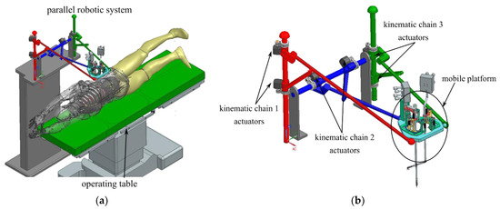CAD model of the optimized version of the parallel robotic system for SILS: (a) relative position between the robotic system and the patient; (b) the 6-DOF parallel robotic system for SILS.