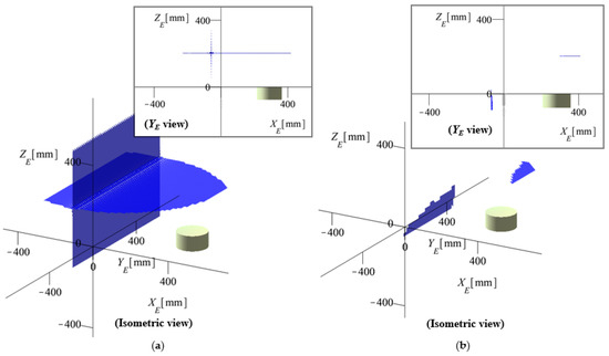 The output singularities for the optimized model were studied by slicing the 6-dimensional (singular) configuration hyperspace, i.e., the numerical values for the angles ψ, θ, and φ were substituted into the singularity factor F (Equation (A1)—Appendix A), and the implicit surfaces (for XE, YE, and ZE) were plotted in Cartesian space.