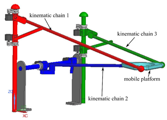 - The parallel robot consists of three (R-PRR-PRS) kinematic chains actuated by the prismatic joints pairs q1 and q2 for the first kinematic chain, q3 and q4 for the second kinematic chain, and q5 and q6 for the third kinematic chain. Furthermore, each kinematic chain has a free rotation motion around the actuation axis of the prismatic joints (Rf1, Rf2, and Rf3, respectively), and three passive revolute joints (R11, R12, and R13 for the first kinematic chain, R21, R22, and R23 for the second kinematic chain, R31, R32, and R33 for the third kinematic chain);