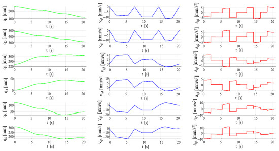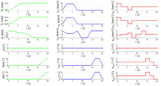 With the Jacobian matrices, A and B, computed from Equation (7) and the inverse geometric model from Equation (5). An input trajectory was provided for the mobile platform coordinates and their velocity and acceleration vectors, respectively. The trajectory was defined as a sequence of motions in accordance with the medical protocol: