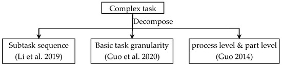 The design tasks proposed by resource requesters [8] are often function-oriented. However, the functions of products or systems vary greatly according to their characteristics. They may be complex systems containing multi-disciplinary tasks, or the design of some parts or product parameters. In the matching process of task and cloud service, when the current cloud service or its combination cannot match the task directly, it is necessary to decompose the task to reduce the task granularity and improve the matching success rate. Aiming at the problems of matching between services and manufacturing tasks, Li et al. [9] proposed a novel service composition-optimization approach called improved genetic algorithm based on entropy. In this method, complex manufacturing tasks are decomposed into subtasks, which are accomplished by appropriate cloud services combined. Guo et al. [10] proposed an optimization mode of complex part machining services based on feature decomposition. In this method, the features of complex parts constitute basic task granularity. Guo [11] divided machining tasks into process level and part level and established a multi-granularity manufacturing-task model oriented to the machining field. Process-level tasks have basic information, processing information, limited information and constraint information. Part-level tasks consist of basic information, parts processing information, service parameter information and constraint information. This method decomposes the processing tasks to a certain extent, but it does not specify the aggregation relationship between the two-level granularity tasks, so it is difficult to support the multi-granularity matching of later tasks and resources. The relative task-decomposition methods are shown as Figure 1.