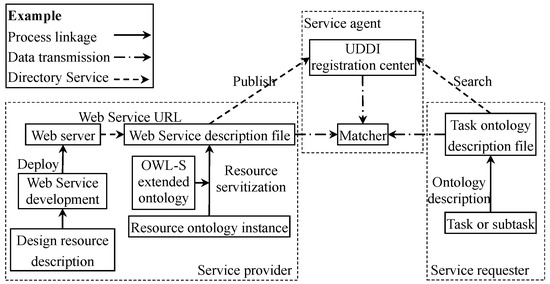 The matching process of task and cloud services is a typical application of a web service. Its basic idea is to search and match the web service description file to find the optimal web service that can accomplish the task and establish the service cooperation relationship with the design resource aggregation by calling the service. Using semantic web services, OWL-S ontology is used to formally define and describe web services when establishing their service description files, which improves the precision in the process of service searching.