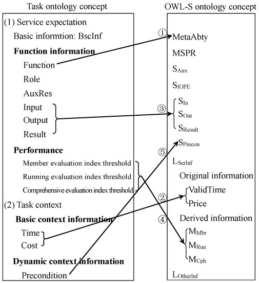 Context refers to the user’s surrounding environment information, their own personalized information and the hardware environment information when they perform the task [49,50]. For the description of tasks proposed by resource users, the existing semantic-description methods basically do not consider the user context information [51], which plays an important role in the matching of resources and services and the optimization of matching results. In this paper, based on the requirements of an ontology model for user context and service expectations, the task-ontology modeling method establishes the formal definition of tasks by describing the service expectation of tasks and the ontology description of the user’s own context information.