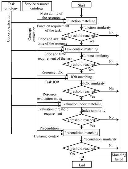 Yu et al. [26] proposed a multi-level aggregate service-planning (MASP) methodology, and the MASP service hierarchy is presented, which deals with the services of multi-granularity and meets the requirements of all relater service providers. However, this method cannot deal with the matching of tasks and services. From the perspective of manufacturing resource retrieval accuracy, Yuan [27] studied the retrieval conditions proposed by resource users and semantic matching of manufacturing resources on the basis of an ontology-based weighted concept network and proposed an independent-element similarity algorithm and concept network-structure similarity algorithm. The language-based method is used to extract, process and calculate the concept of retrieval conditions.
