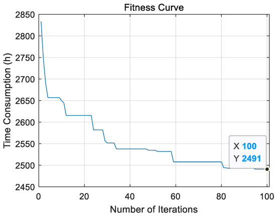 After completing 100 iterations in MATLAB, the time consumption of each service composition in the population is shown in Table 4, and the objective function curve is shown in Figure 18. In Table 4, the time consumption of No.23 chromosome is the shortest, indicating that in the process of completing the specified design tasks, the time consumption of No.23 service composition is the shortest, and the task allocation of each cloud service resource is shown in Table 5.
