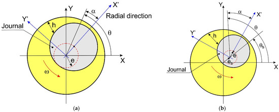 The approach to the analysis of the dynamic performance of SFDs is to simulate circular orbits of the shaft, whether centered (see Figure 2a) or not (Figure 2b), or small perturbations around the position of equilibrium. For simplicity, the proposed model is developed for centered circular orbits (CCOs), but it can easily be adopted for non-centered circular orbits or even noncircular orbits and oscillations around the equilibrium position if it is possible to identify a function that describes the behavior of the oil film thickness as a function of the time.