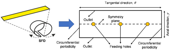 The circular geometry of the hole is simplified as a rectangle, as shown in Figure 4. At the edges of the boundary, the pressure is constant and equal to the feeding one imposed at the center. Considering that the flow from the hole is delivered in both axial and tangential directions, the whole geometry of the SFD must be considered.