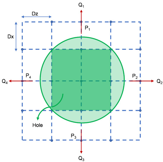 where is the interpolation of the three points above the boundary of the hole, and is the oil film height at from the side of the rectangle. Similar expressions can be written for the rest of the flow vectors. The same holds for all other sides , , and .