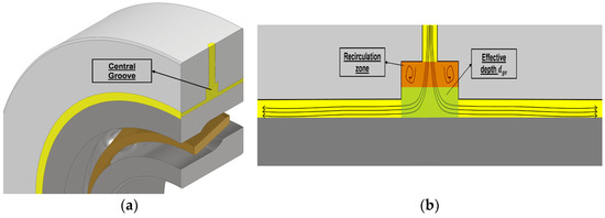In [34,37] it is proposed to model the feeding groove as a reservoir of oil at the feeding pressure. In [22], San Andrés et al. report instead that large values of dynamic pressure in the groove region occurred proving the previous assumption to be wrong. The same approach introduced in [28] is considered when modeling the presence of grooves. As shown in Figure 5b, the flow inside the groove is divided into two regions: a recirculating one and a through-flow close to the journal. Only the second one is active in the dynamic pressure generation, and therefore an effective groove depth is considered. Moreover, the feeding orifices are considered.