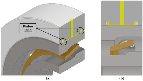 In this case the SFD is subjected to high air entrainment, comporting a reduction of the damping capacity of the device. With an open-ends configuration, the exiting flow rate is higher, a condition that will require a higher inlet flow rate of oil. For this reason, SFDs are usually sealed at the ends. The sealing is usually not complete otherwise. Due to the oil heating, the damping capacity would decrease. In the scientific literature, it is possible to find many types of sealing to reduce the leakage of the SFD. One of the most common is the piston ring shown in Figure 6 [5,35,38].