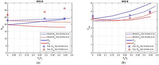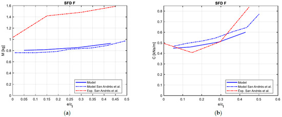 SFDs E and F are tested with a fixed static eccentricity and by changing the amplitude of the circular orbit vibration. The considered ratios are: , , and . The tested frequencies are for SFD E and for SFD F. The obtained coefficients are constant for the whole frequency range, therefore only the values at and 5 are shown respectively. The evolution of both the mass and damping coefficients for SFD F is shown in Figure 7, where it is possible to see that the results obtained with the model presented in this paper agree well with both the experimental and numerical results in [22].