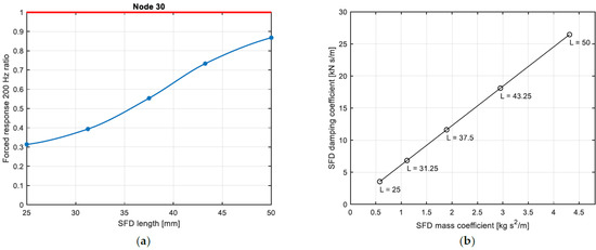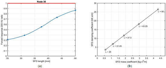 The effect of the length of the SFD on the forced response is investigated. For this analysis, the selected SFD clearance is because it minimizes the vibration level at and guarantees an acceptable level for the resonance peak vibration. The ratio of the forced response at for the original configuration and the configuration with the SFD is shown in Figure 18a. The minimum forced response is obtained when the shortest SFD is considered. The force coefficients of the SFD increase with the SFD length, see Figure 18b. Therefore, also in this case, the most suitable SFD to reduce the vibration level at is the one characterized by the lowest force coefficients.