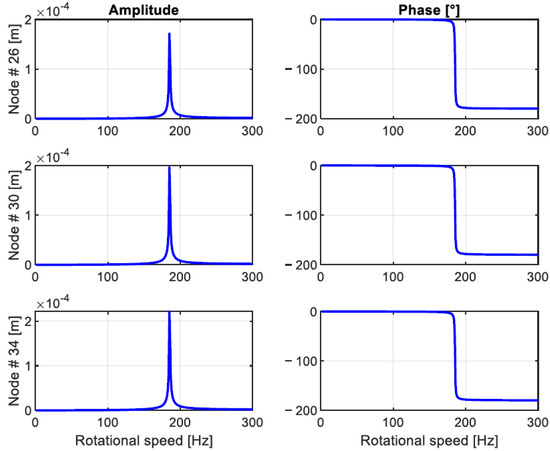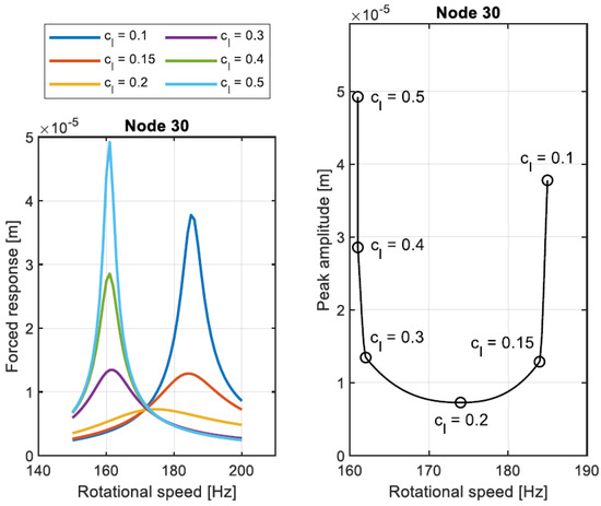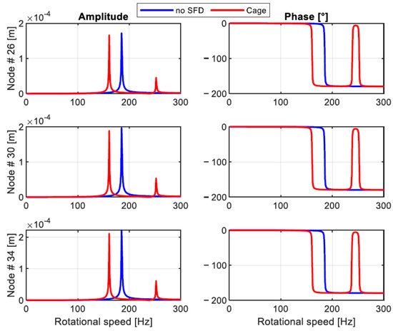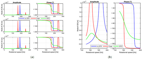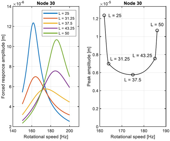 The comparison between the forced responses obtained considering the different values of length of SFD is shown in Figure 19. Moreover, in this case, the results are reported in the frequency range of interest. It is possible to see that the minimum forced response at is obtained with the shortest damper. On the contrary, the minimum of the vibration peak is obtained when as shown in the right part of Figure 19. Therefore, the proper SFD configuration must be selected according to the optimization required.