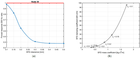 Forced response ratio at for node 30 for different values of SFD clearance (a), evolution of SFD force coefficients with clearance (b).