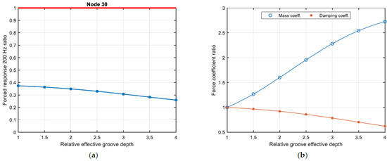 Another tuning parameter that can be selected for the geometry of the SFD is the effective depth of the groove. For this reason, different values of have been investigated. For convenience, the relative value of the effective groove depth is considered (). The ratio of the forced response at for the original configuration and the configuration with the grooved SFDs is shown in Figure 20a. The clearance considered is and the lands of the SFD have a length of . The groove length considered is and it is placed in the center of the SFD. When the effective groove depth is one, the damper geometry results in a grooveless damper of length . From the analysis shown in Figure 20a, the higher the groove depth, the lower the forced response at . The evolution of the ratio between the SFD force coefficients for the different values of the relative effective groove depth and the values obtained when is shown in Figure 20b. Increasing the groove depth, the damping coefficient is reduced while the mass coefficient is highly increased. The evolution of the forced responses for the considered frequency range is shown in Figure 21. Moreover, in this case, the configuration that minimizes the forced response at is not the one that minimizes the amplitude of the peak.