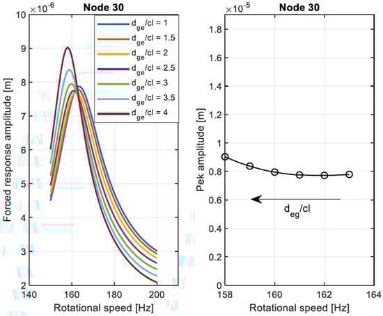 The first parameter to be investigated is the clearance of the SFD. The ratio between the forced response at of the configuration with the SFD and the original one is shown in Figure 16. The forced response decreases with the increase of the SFD clearance even though the damping coefficients increases when the SFD clearance is decreased. This behavior is related to the increase of the resonance frequency when the SFD clearance is reduced. Therefore, a higher level of vibration is obtained at (see Figure 17).
