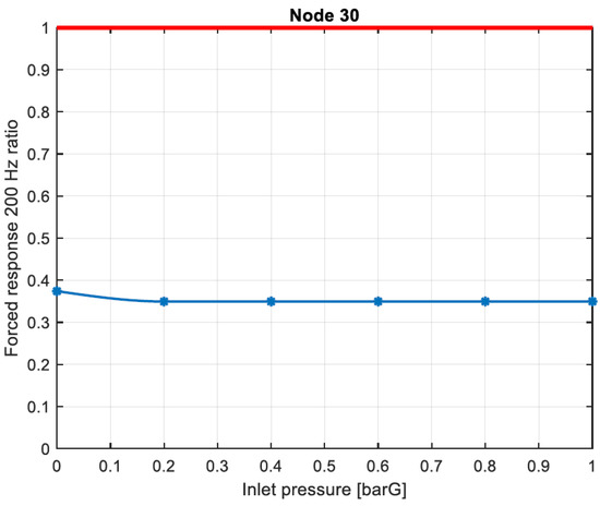 In this section, the feeding system is considered. The SFD considered has a length of and clearance equal to and the diameter of the holes is considered equal to . Moreover, the coefficient is considered as . The effect of the feeding pressure on the forced response has been investigated. The ratio of the forced response at for the original configuration and the configuration with SFDs is shown in Figure 22. When the feeding pressure is considered zero, the feeding system is not included in the modeling. The presence of the feeding system seems to have a small impact on the forced response at and the inlet pressure is not influencing the forced response.