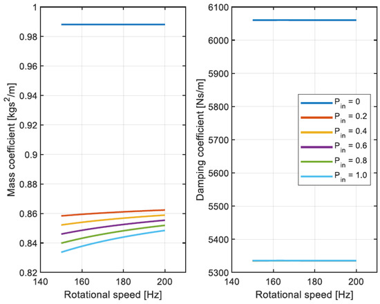 Evolution of xx mass and damping coefficient with the rotational speed considering different inlet pressure values.