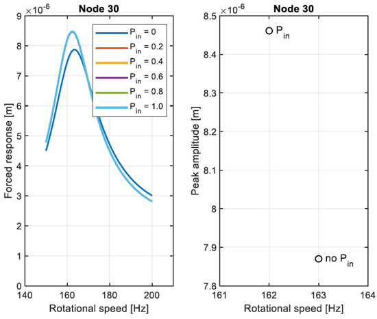 Then, the effect of some geometrical parameters on the forced response of the system is evaluated. As previously mentioned, the operating frequency considered is . Therefore, considering the evolution of the forced responses shown in Figure 15, the frequency range from to is considered for the following analysis.