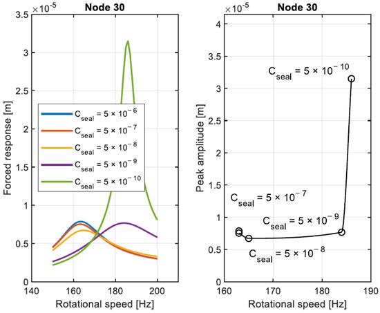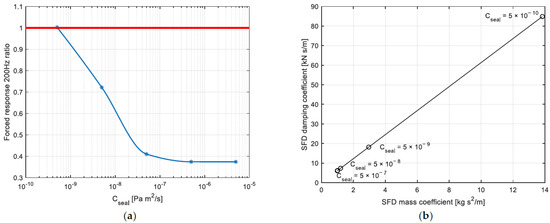 For convenience, the effect of the sealing mechanism is shown considering the overall seal coefficient . The highest value of corresponds to the open ends condition while the lowest value of corresponds to the ideal condition of complete sealing. The ratio of the forced response at for the original configuration and the configuration with the sealed SFDs is shown in Figure 25a. Increasing the sealing effect determines an increase of the forced response at at node 30. The evolution of the force coefficients with at is shown in Figure 25b. Increasing the sealing effect determines an increase of both the force coefficients of the SFD.