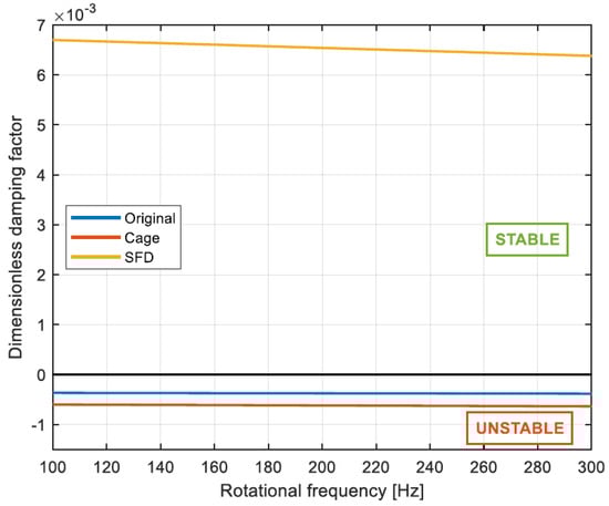 The SFD considered is similar to that described in Table 2 but now the clearance is set to . The dimensionless damping factor for the original system, system with the cage, and the system with the SFD is shown in Figure 27. Both the original system and the system with the cage are affected by instability. On the contrary, when the SFD is added to the system the correction of the instability is achieved.