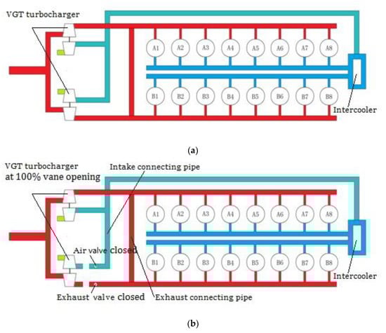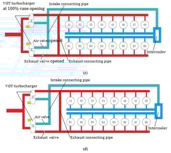 There are three types of turbochargers by adjusting the state of the valves and vane openings, namely the VGT (Figure 1a), the STC (Figure 1b,c) and the compound VGT-STC (Figure 1d), and the specific control strategy is shown in Table 2. The VGT type turbocharging system has both air and exhaust valves opened all the time and the vane opening can be increased with the increasing of speed and load. The STC system has a vane opening that is fixed in 100% and the boost system uses the 1TC mode, it increases the intake pressure and improves the performance at low speeds and in low load conditions, while the STC system’s use in the 2TC mode achieves the rated power in high-speed conditions. The compound VGT-STC system has all of the valves opened or closed and the vane opening can also be regulated. It is more flexible to match the turbocharger with a diesel engine. The upgrade to the original boost system consists of two parts: (1) Connects the intake and exhaust pipes of row A and row B, respectively, and installs the valves at the appropriate positions in row B. (2) The VGT turbocharger replaces the FGT. The VGT turbocharger is modified from the original FGT, which has added the motion mechanism to rotate the nozzle vane. The most important point is that the maximum opening (100% opening) of the VGT vane is consistent with the position of the original turbocharger and the compressor is not changed. The choked flow of the turbo corresponding to the 0%, 33%, 67%, and 100% vane opening is 1.6, 1.8, 2.0 and 2.2 kg/s, respectively.