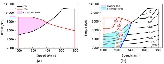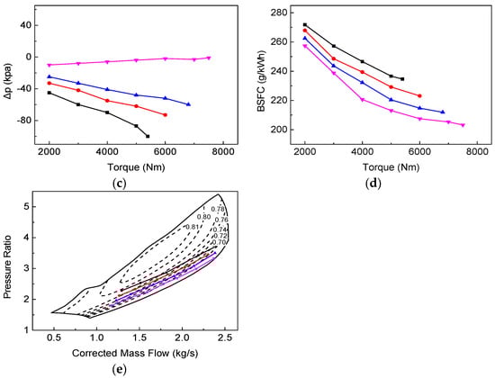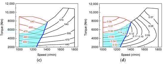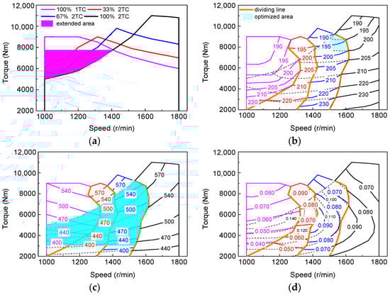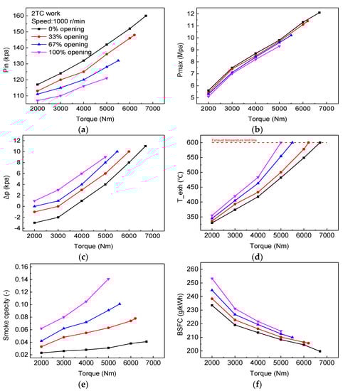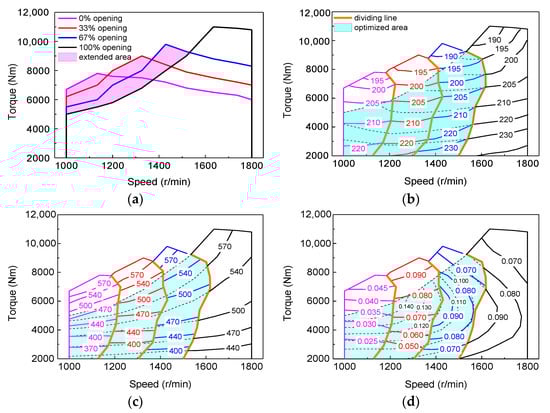 The VGT system contains four operating states with the 2TC, namely at a 0% opening, 33% opening, 67% opening, and a 100% opening. The engine operating range expands at low and medium speeds compared with the baseline, as shown in Figure 8a. As the speed increases, the expanded area increases steadily due to the increase of intake pressure, and the operating range is expanded by 25.0% between 1000–1500 r/min. The dividing line between the different vane openings is calculated according to the lower BSFC, as shown in Figure 8b. The optimized area almost occupies 70% of the original range and the lower the speed, the higher the improvement of the BSFC. The exhaust temperature (Figure 8c) and the smoke opacity (Figure 8d) also decreased greatly within the optimized area. From a global perspective, the smoke opacity, BSFC, and the exhaust temperature are significantly reduced with an average drop of 0.053, 7.2 g/kWh, and 60 °C in the optimized areas, respectively.