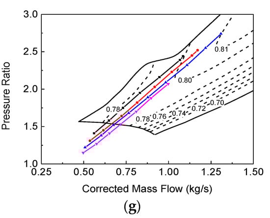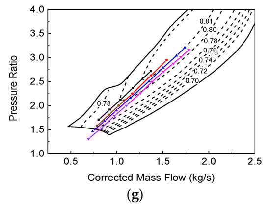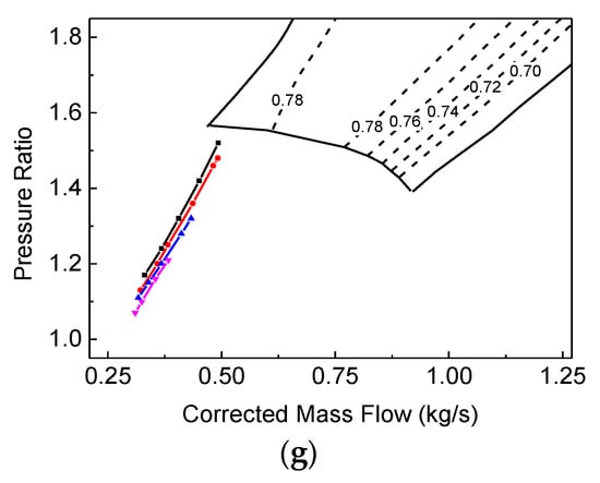 Figure 2g, Figure 3g, and Figure 4g show the variations on the compressor map with the different VGT vane openings. In the same operating conditions, when the VGT vane opening is small, the position of the operating point is relatively located in the upper right side, indicating a higher intake pressure and much more airflow, as reported in Ref. [19]. At 1000 r/min, all of the operating points are located below the compressor map. While at 1429 r/min and 1800 r/min, the variations are located in large flow and high-efficiency areas. It is worth noting that some positions of a 0% vane opening at 1429 r/min (Figure 3g) are close to the surge boundary, which is harmful to the compressor.