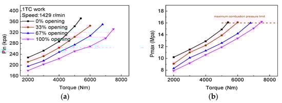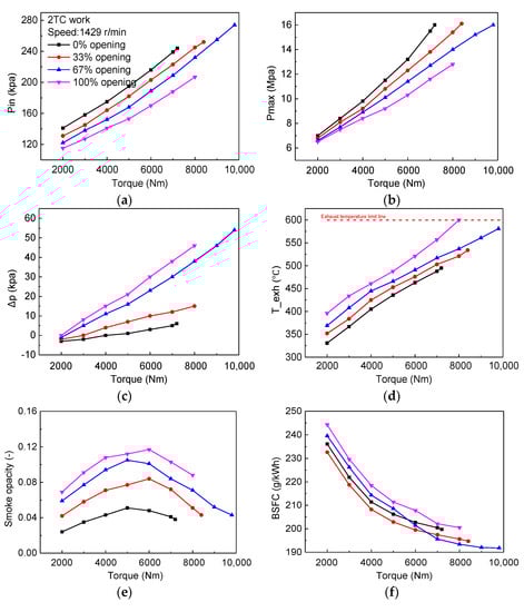 It also can be found in Figure 2, Figure 3 and Figure 4 that the maximum torque increased with a small vane opening at 1000 r/min and 1429 r/min compared with the baseline. The exhaust temperature is the major factor that limits the torque at low speeds, while the small vane opening received a higher Pin and a lower Texh, therefore the maximum torque increased. In contrast with the baseline, the maximum torque at 1000 rpm and 1429 rpm had been increased by 1700 Nm (34%) and 1800 Nm (22.5%), respectively. At 1000 r/min, the maximum torque is still restricted by the exhaust temperature at the 0% vane opening (Figure 2d), indicating that the VGT turbochargers cannot provide enough fresh air. At 1429 r/min, the limiting factors are the maximum combustion pressure in the 0% and 33% vane openings (Figure 3d), indicating that the VGT turbochargers can provide enough air.