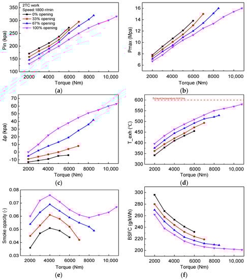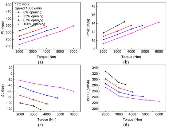 For the VGT-1TC, the variation trend of some parameters, such as the smoke opacity and exhaust temperature, are consistent with the VGT-2TC, so we do not repeat them here, we will just show the different aspects. It can be intuitively observed that the pin (Figure 5a, Figure 6a, and Figure 7a) and Pmax (Figure 5b, Figure 6b, and Figure 7b) are much higher than the 2TC in the same operating conditions. The reason for that is because all of the exhaust flows into only one turbocharger instead of dividing the exhaust into two turbochargers, which increases the turbocharger speed and the intake pressure, as reported in Ref. [25]. It is worth noting that the lowest BSFC (Figure 5d, Figure 6d, and Figure 7d) can be obtained in the 100% vane opening in all speeds, this is because the pumping loss (equal to the Δp) plays a more important role on the BSFC than the combustion process (equal to the Pin) with the VGT-1TC. It can also be found that the VGT-1TC has no ability to regulate because of the constant (100%) best vane openings for all speeds. As a result, the BSFC has been decreased by 20.1 g/kWh on average.