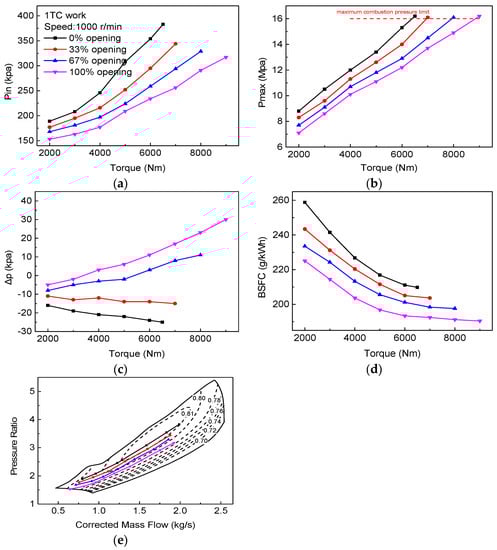 Variations of the main engine parameters at 1000 r/min with the 1TC. (a) intake pressure. (b) the maximum combustion pressure. (c) difference between the intake and exhaust pressures. (d) brake specific fuel consumption. (e) compressor.