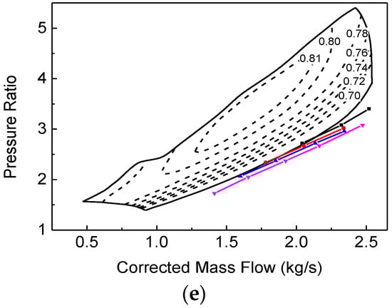 The variations of the compressor are very different in contrast with the VGT-2TC, as shown in Figure 5e, Figure 6e, and Figure 7e. At 1000 r/min, the operating points are in the center of the compressor map, indicating that the compressor worked in the high-efficiency area. At 1429 r/min, the variations are close to the choke line, which means the compressor efficiency had dropped down greatly and would choke. At 1800 r/min, the compressor worked at the choked area of the map, which showed that the compressor had a significant flow blockage, as reported in Ref. [26]. Therefore the feasible speed operating conditions are 1000~1429 r/min for the VGT-1TC.