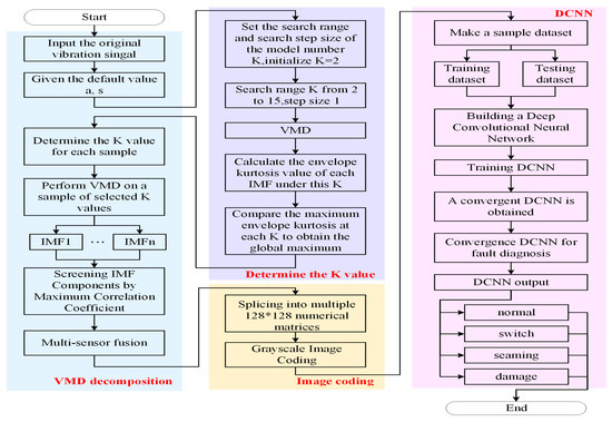 Based on the construction of “2.4” section grayscale image coding based on VMD-multi-sensor fusion and “2.5” section construction of convolutional neural network, this paper proposes a multi-sensor fusion rail surface defects recognition method based on VMD grayscale image coding and DCNN. Figure 1 is the overall algorithm flow chart.