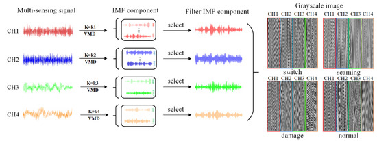 Rail vehicles contain strong background noise in actual work, which makes it difficult to obtain comprehensive state characteristics by analyzing the signal measured by a single sensor, which affects the accuracy of state recognition, and the selection of better sensor location depends on the practical test experience of experimenters. Therefore, at the feature level, this paper arranges the filtered IMF components in turn and converts them into grayscale images. The grayscale image coding is shown in Figure 2.