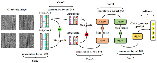 Through the data set, each group of networks designed in Table 1 are trained, tested, and compared one by one, and the network structure is finally determined. The convolutional neural network has a total of 15 layers, including 5 convolutional layers, 4 pooling layers, 4 random deactivation layers, 1 global average pooling layer, 1 softmax layer for classification, that is, the output layer, use 3 × 3 convolution kernel, the last convolutional layer adopts a 1 × 1 convolution kernel and uses ReLU as the activation function to adjust the classification output results after the global average pooling layer to 4 categories. The structure diagram of deep convolutional neural network is shown in Figure 3, and the parameters of each layer are shown in Table 2.