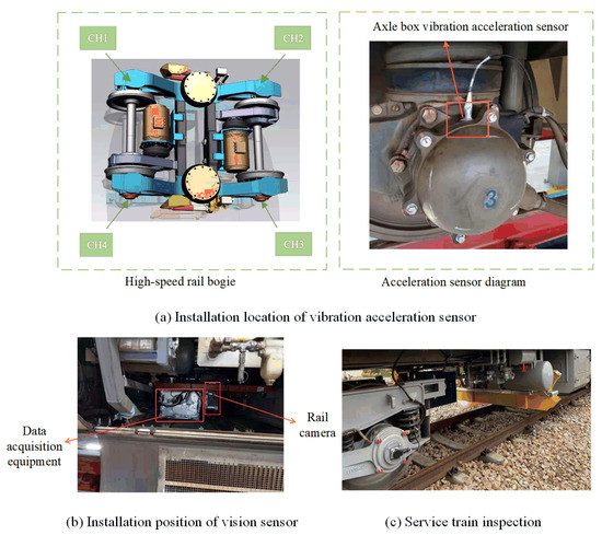 The data in this paper comes from the measured data of axle box vibration acceleration of high-speed trains on Shanghai Nanjing intercity uplink and downlink lines. The test time is from 23 to 24 December 2020, the sampling frequency is 12,800 hz, and the data was saved every 1 h. The data range is 19:00:00–23:59:59 on 23 December 2020 and 19:00:00–23:59:59 on 24 December 2020. The test equipment adopts four vibration acceleration sensors and one visual sensor. All the parameters of sensors during measurements have been indicated in Table 3. According to those characteristics of the sensors, the installation position of the test equipment and sensors is shown in Figure 4. The vibration acceleration sensor simulates the pre-installed vibration sensor on the axle box of the service vehicle, and the vision sensor can simultaneously collect the rail image, which is convenient to provide a label reference for the vibration data during the production of the data set. The final rail defect identification model still only uses the vibration signal data of pre-installed and in-service vehicles.