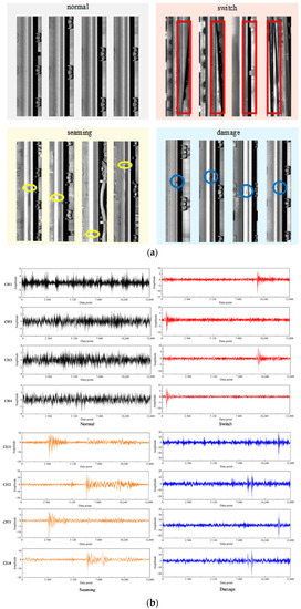 The images of special rail sections, such as switch, seaming, and damage are extracted by image recognition software, and the acquisition time corresponding to the image is obtained. According to the collected passing time of special section, extract the axle box vibration acceleration data corresponding to the image, and obtain four defect samples of rail surface, i.e., switch, seaming, damage, and normal. The four defect images of the rail surface are shown in Figure 5a, and the vibration signal waveforms of the four states are shown in Figure 5b.