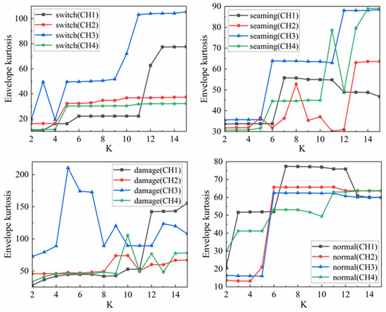 In the search domain, the relationship between the four channels mode number K and the maximum value of the envelope kurtosis is plotted in Figure 6. For the four defect samples of the rail surface, the maximum value of the envelope kurtosis can be obtained when each sample of the four channels takes the optimal mode number K’. The relationship is shown in Table 6.