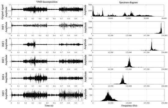 Several vibration signal processing methods have been introduced and mentioned in literature review, but only VMD can be adapted and is suitable for rail inspection. The core of the denoising progress is to extract the feature or useful information and devote the noise into different parts or layers [47,48,49]. Therefore, VMD is based on Wiener filtering theory, which can be used here. VMD is a completely non recursive variational mode decomposition model. In this algorithm, the intrinsic mode function (IMF) is defined as a bandwidth limited AM-FM function. VMD algorithm decomposes the original signal into a specified number of IMF components by constructing and solving the constrained variational problem. Before VMD decomposition of the signal, the parameters of VMD need to be determined, that is, the mode number and penalty factor need to be determined in advance. After determining the influence parameters, the signal is decomposed by VMD to obtain a series of intrinsic mode functions (IMFs) [47,48].