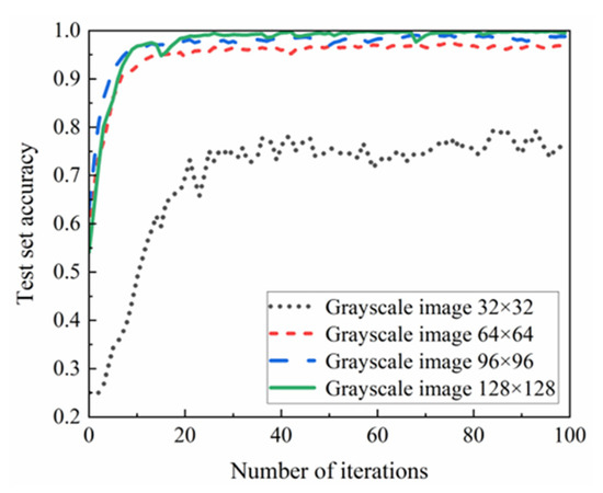 Using the same dataset from the previous section, the data of switch defects, seaming defects, damage defects, and normal states are selected to generate two kinds of grayscale images, normal state, and other state. According to the method proposed in this paper, the measured axle box vibration data set is tested. Figure 14 shows the grayscale images with 128 × 128 pixels.