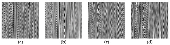 - Assuming the size of the grayscale image to be constructed as (generally , , , etc.), divide the width into 4 equal parts, construct 4 regions of , and fill the IMF components filtered by each sensor signal in turn according to the size of the region;