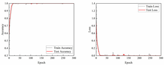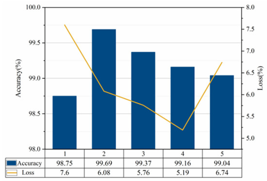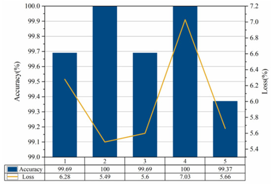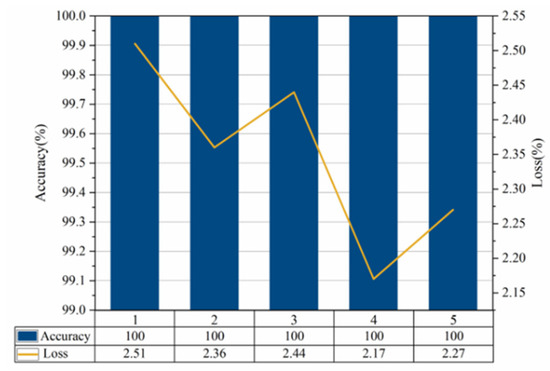 Run the network five times, and Figure 15 shows the identification accuracy and loss rate of the test set obtained from the five tests. Among them, the accuracy changes and loss change curves of the training set and test set in the fourth test are shown in Figure 16.